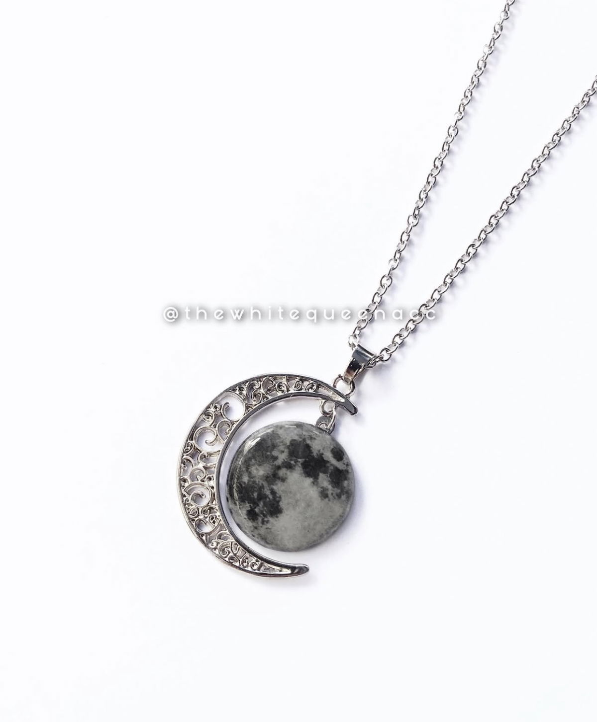 Este es un hermoso collar de luna llena con una media luna plateada. La media luna está delicadamente ornamentada con detalles intrincados que le dan un toque elegante y místico. En el centro, se encuentra la luna llena, con una textura que evoca el aspecto de la superficie lunar. La combinación de la media luna y la luna llena simboliza el ciclo lunar completo, transmitiendo una energía de plenitud y renovación. La cadena es fina y plateada, complementando el colgante de manera sutil y sofisticada.