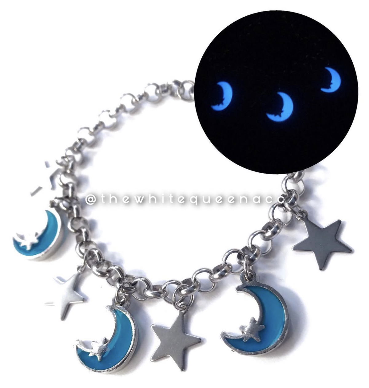Una elegante pulsera plateada adornada con delicados colgantes de medialunas y estrellas. Cada medialuna tiene un acabado brillante que refleja la luz suavemente, mientras que las estrellas añaden un toque celestial y mágico. El diseño es minimalista pero encantador, evocando un ambiente nocturno y misterioso. La combinación de los símbolos de la luna y las estrellas crea una sensación de equilibrio y serenidad, haciendo de esta pulsera un accesorio perfecto para quienes buscan conectar con la energía del cosmos de manera sutil y sofisticada.