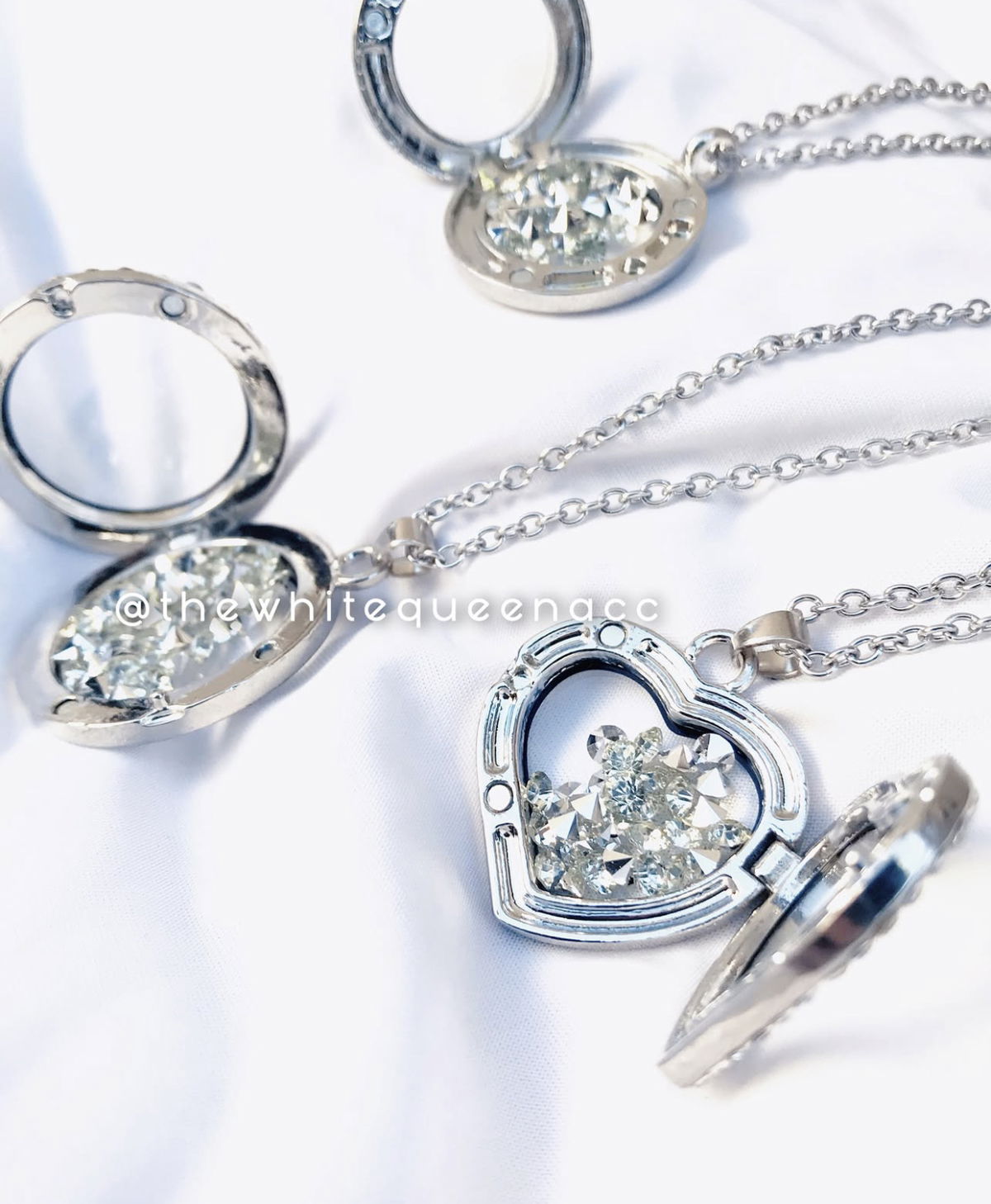 Estos elegantes collares plateados presentan colgantes transparentes que encierran delicados cristales brillantes, creando un efecto sofisticado y moderno. Disponibles en formas circulares y de corazón, cada colgante está adornado con un marco de brillantes que le agrega un toque de lujo. Perfectos para cualquier ocasión, estos collares son el accesorio ideal para quienes buscan un estilo reluciente y llamativo. ¡Dale un toque de brillo a tu look o compártelos como un detalle especial con alguien que aprecie la elegancia!