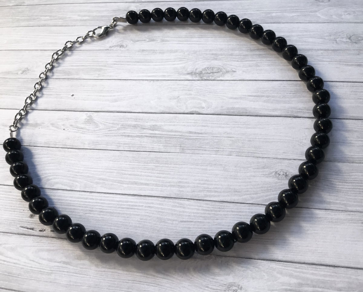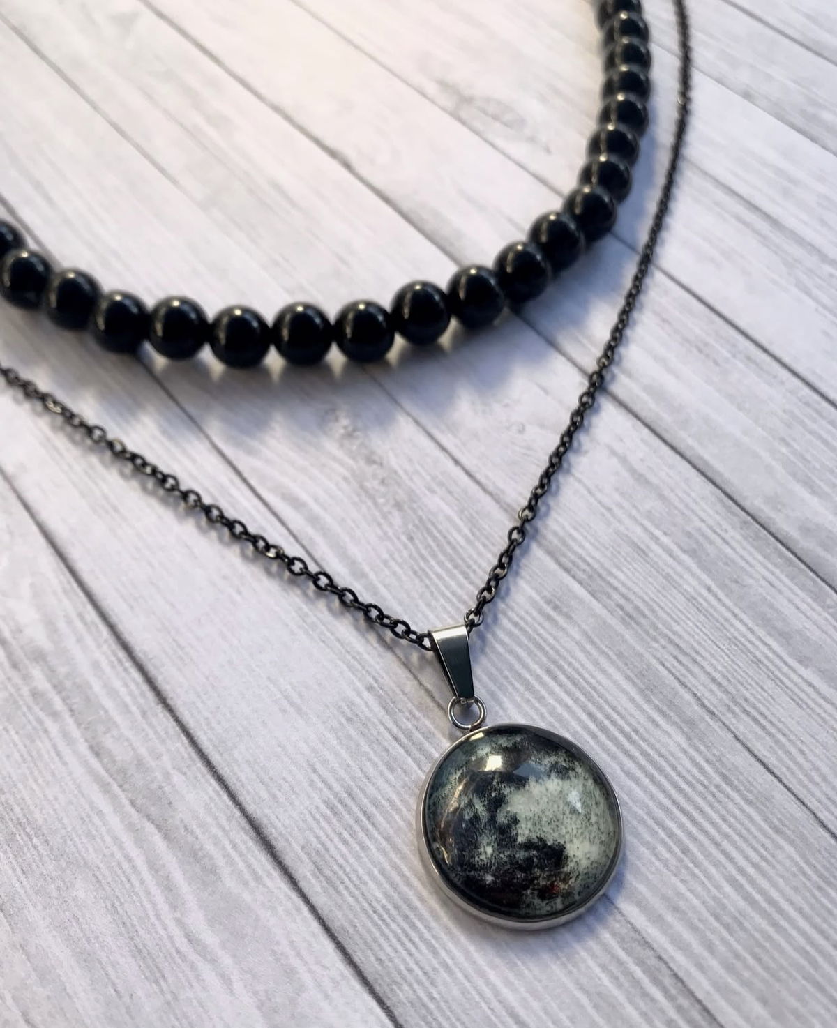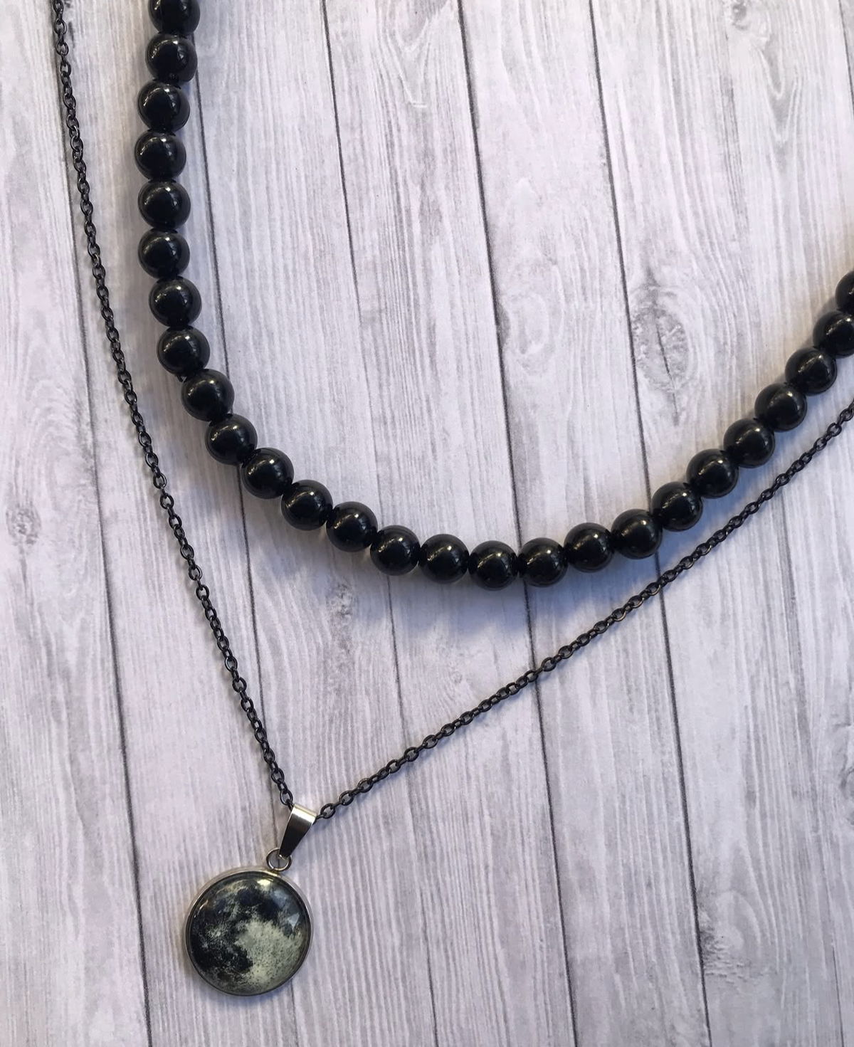 Cadena de acero negra con luna que brilla en la oscuridad + collar de cuentas negras.