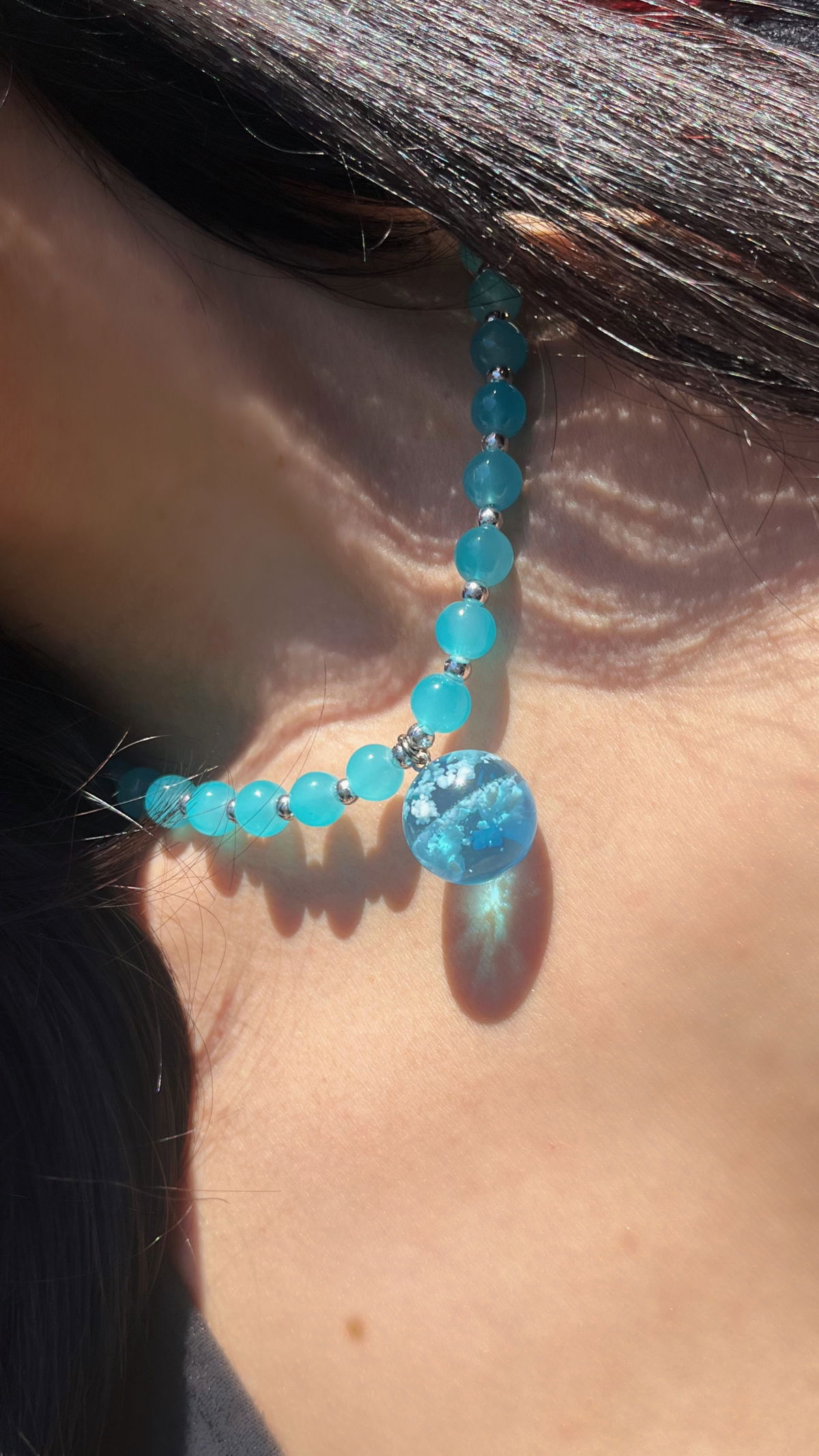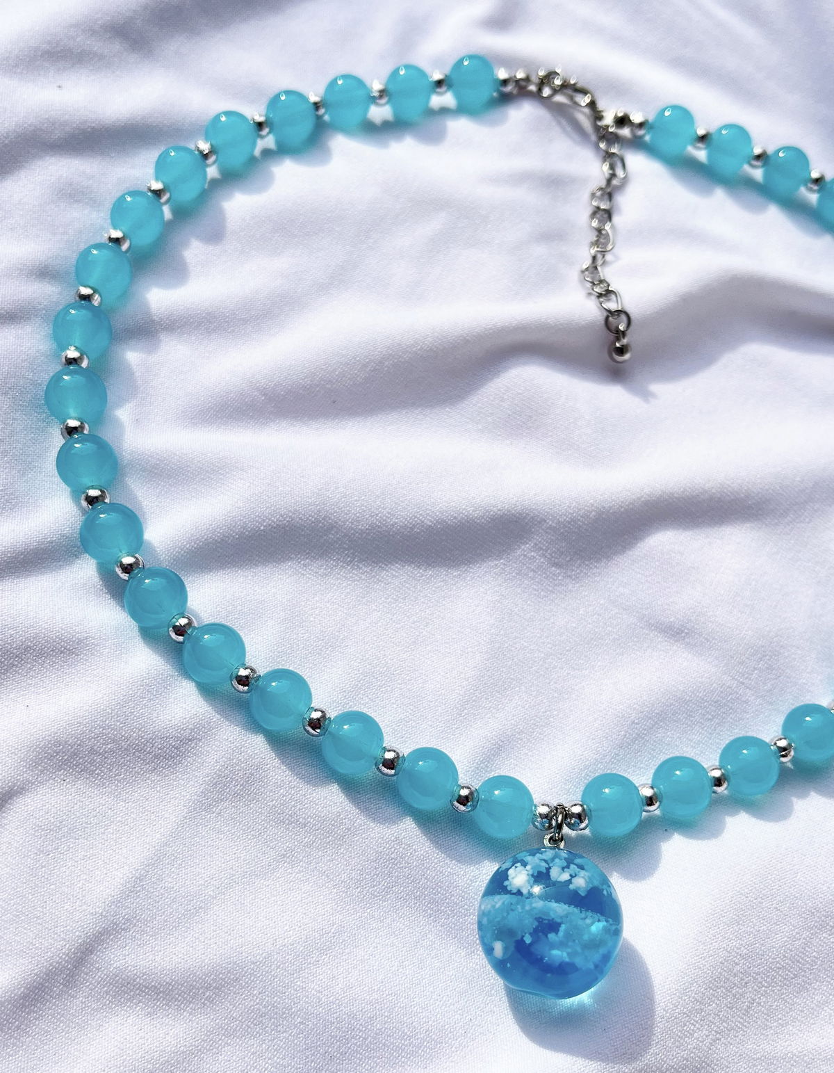 Cuentas de vidrio, hilo de acero y dije de resina. Largo total 47 cm