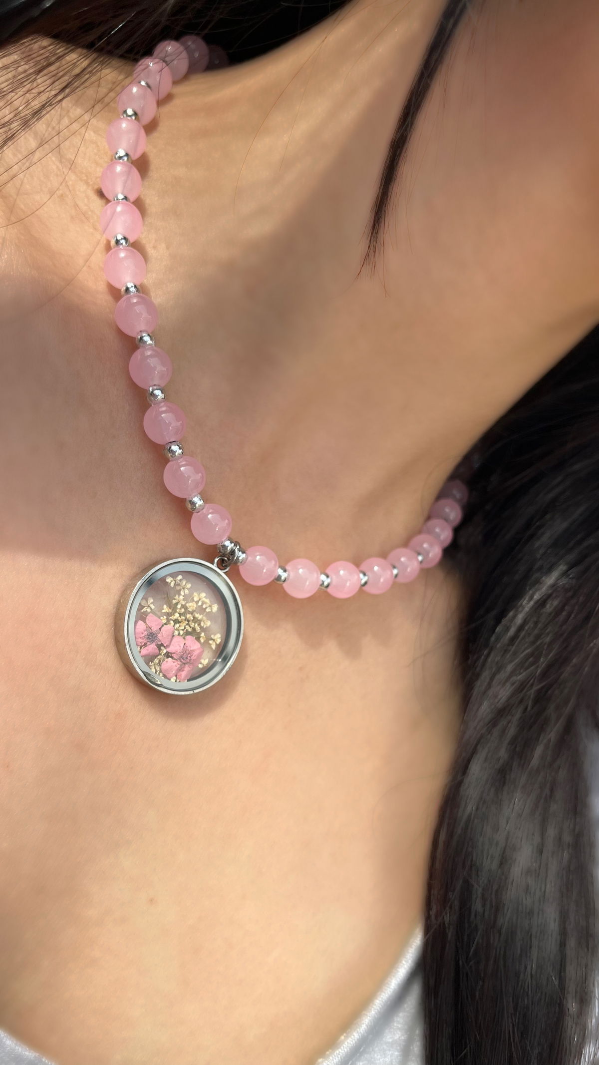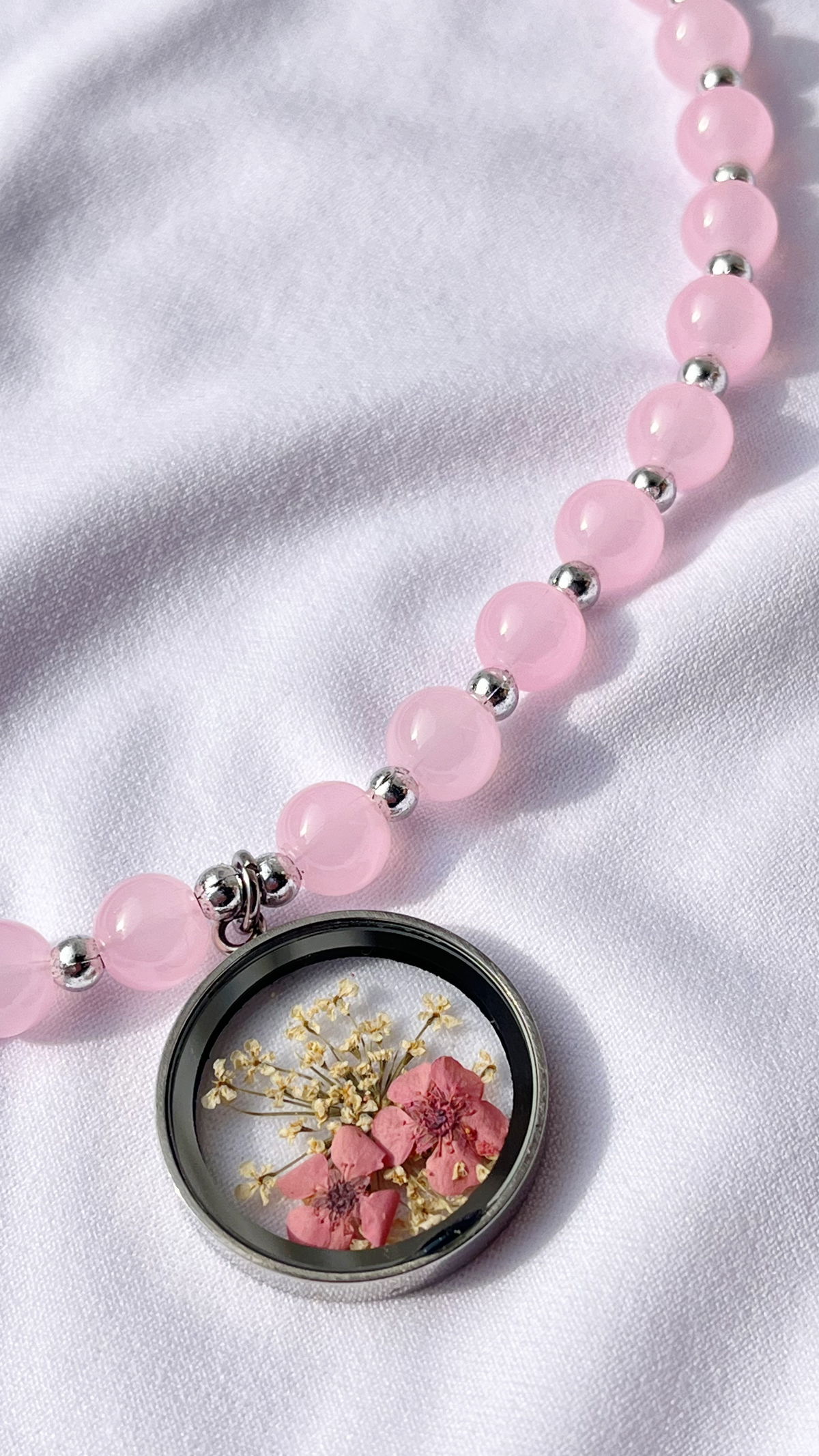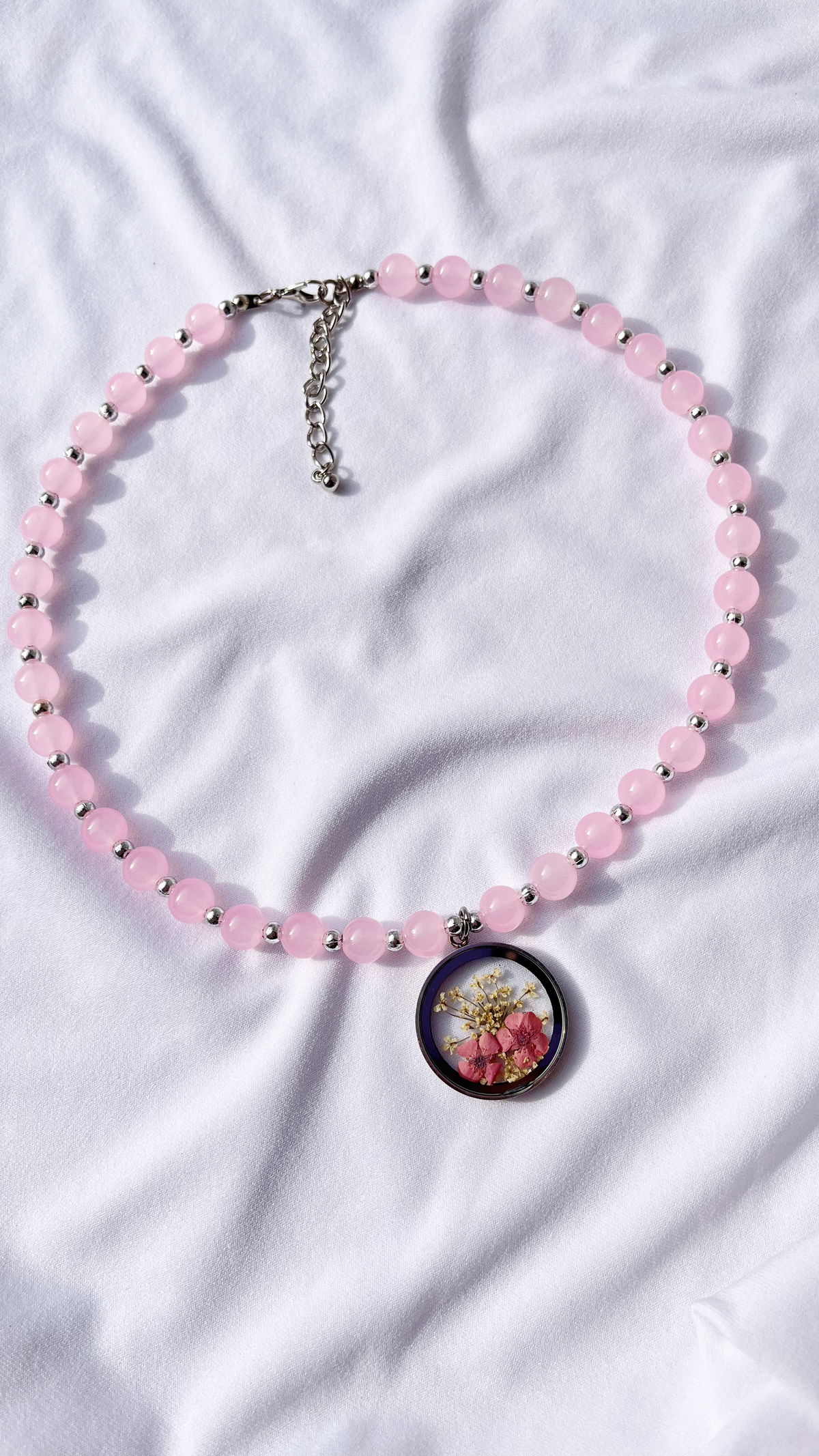 Collar regulable de 40 a 47 cm con cuentas de vidrio, dije de vidrio, acero quirúrgico y flores secas